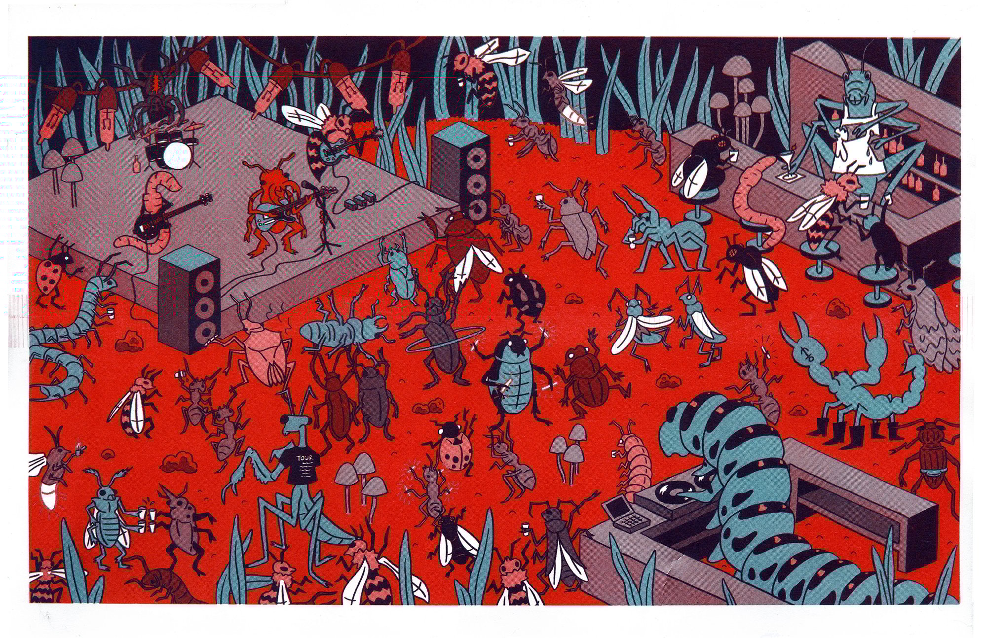 Boogie Bugs, 11” x 17”, risograph, 2025, by Doug Eberhardt